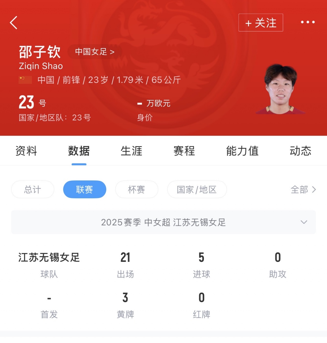 22岁的邵子钦刚刚以主力身份代表中国女足征战了2026年女足亚洲杯,在5场比赛中4次首发出场,贡献了2个进球和1次助攻。此外,她还以21次射门成为整届杯赛“开火”次数最多的球员。在亚洲杯上,邵子钦与澳大利亚女足前锋科尔交换球衣的一幕经澳大利亚官方社交媒体传播,火遍全网。